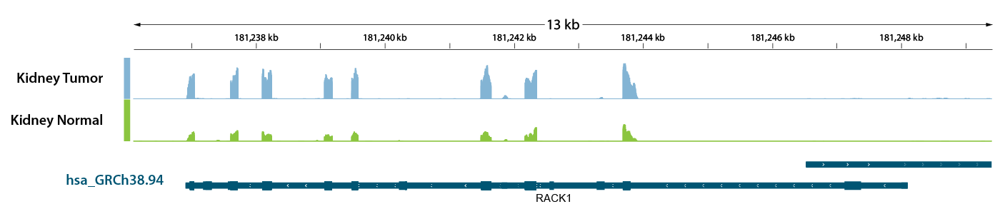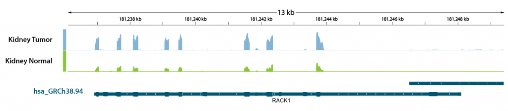 We used the same RNA isolated from human kidney tumor FFPE tissue samples and matched normal, healthy FFPE tissue, but we performed a WTS experiment this time. As a showcase, we looked at RACK1 (Receptor for Activated C Kinase 1), located at the 5q35.3 gene, implicated in 5q copy number gains and upregulation in kidney cancer and associated with the interferon-alpha inflammatory response33. As shown on Figure 4, we can see the upregulation of RACK1 in kidney tumor FFPE samples. WTS also allows us to see which RACK1 exons are being expressed – observe the “spikes” in the upper panel (Kidney Tumor, blue) and middle panel (Kidney Normal, green), and the dark blue blocks in the hsa_GRCh38.94 gene body representing exons in the lowest panel.