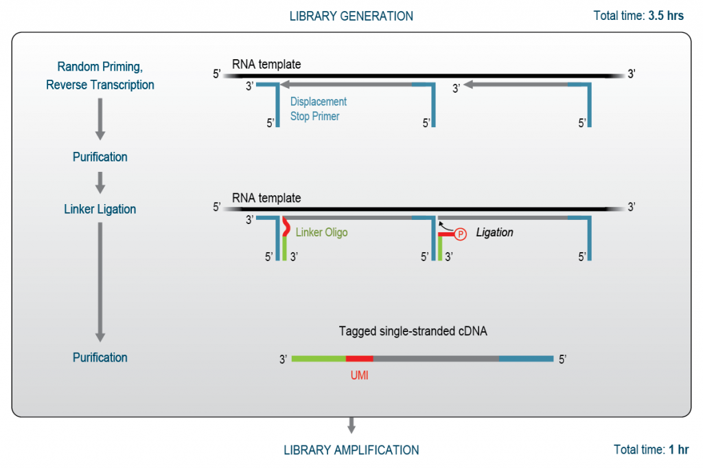 Figure 2 | CORALL RNA-Seq Library Generation Workflow. Random displacement stop primers (DSP) containing partial adapter sequences initiate reverse transcription and cDNA synthesis. Each reverse transcribed fragment is stopped at the downstream DSP. An efficient linker ligation step introduces a second partial adapter sequence and a UMI, resulting in a single-stranded cDNA library that is amplified to conclude NGS library preparation.