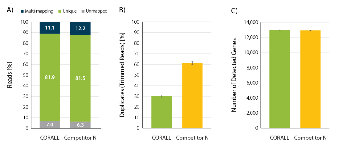 Figure 3| Read mapping statistics (A), FastQC duplicate detection (B), and gene detection at a threshold of CPM>10 (C) for CORALL FFPE and competitor libraries generated from 10 ng mouse liver FFPE RNA (DV200 = 79 %) following ribo-depletion at 15 M paired end reads per sample (2×75).