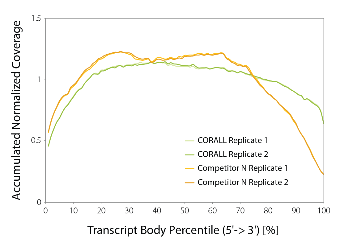 Figure 5 | Accumulated transcript body coverage (whole transcriptome). Coverage across all transcripts was generated using the geneBody_coverage.py tool provided by RSeQC (transcripts length normalized to 100 %). CORALL FFPE coverage is compared to competitor N at 1.2 M single reads per sample.