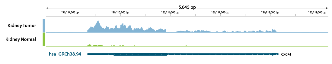 CORALL FFPE detects upregulation of tumor marker transcripts as exemplified by elevated coverage of Chemokine Receptor CXCR4 in kidney tumor FFPE samples. CXCR4 is associated with an increased risk and the incidence of renal cell carcinoma and its progression (Fig. 6).
