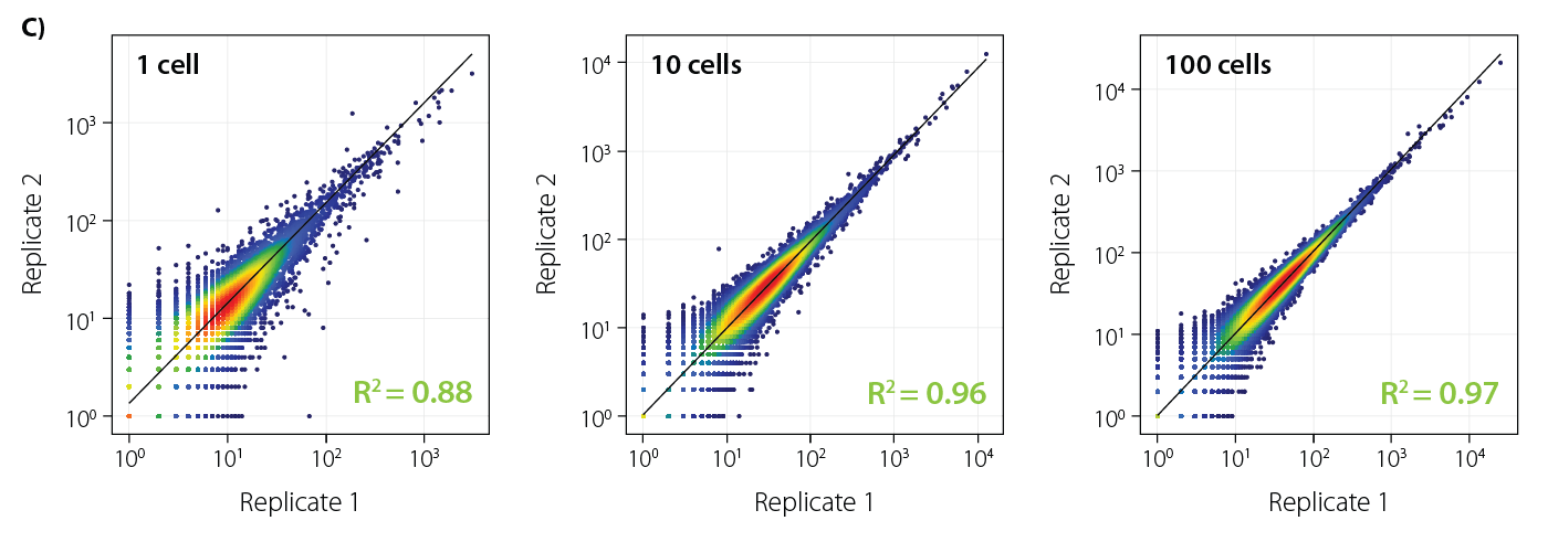 Sample input ranges from 10 pg (equivalent to the RNA content in one single cell) up to 10 ng. Read depth of 1 M reads / sample is usually sufficient to capture the full gene diversity, while 5 M reads / sample may be necessary for a comprehensive analysis of all transcripts (typically, there are multiple transcripts for each gene).