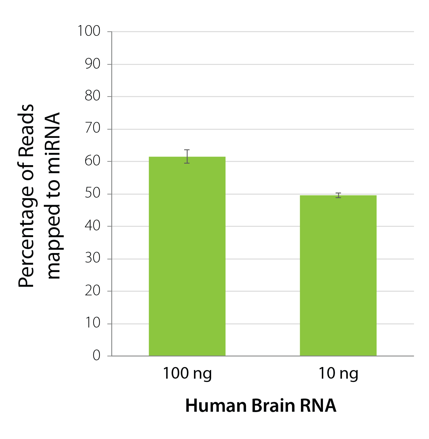 Figure 2 | Percentage of reads mapping to miRNAs. Libraries were prepared in triplicates from 100 ng and 10 ng of human brain RNA using the miRVEL Profiling Small RNA-Seq Library Prep. The obtained libraries were sequenced on NovoSeq X and downsampled to 1 M read / sample.