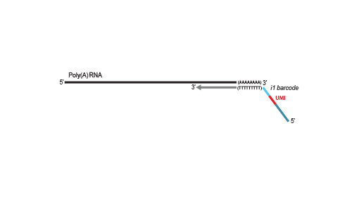 Library generation is initiated by oligo(dT) priming. The primer already contains a partial Illumina-specific Read 2 linker sequence, Unique Molecular Identifiers (UMIs), and an i1 sample-barcode to uniquely label each sample.